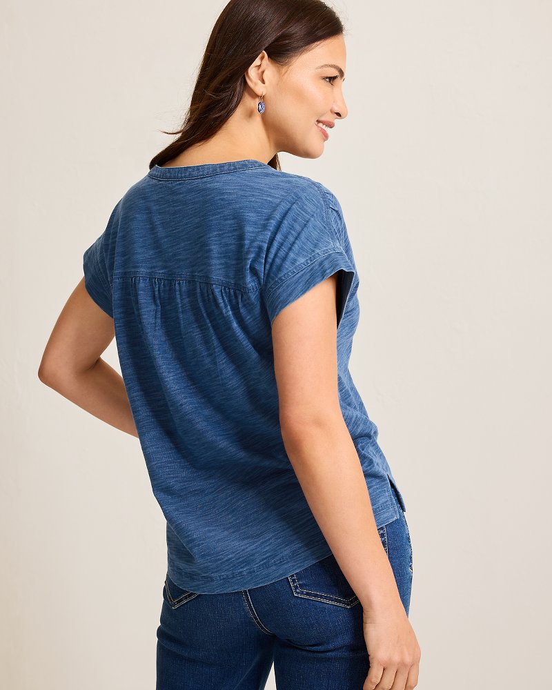 Intricate cross-stitch embroidery and a sophisticated, slubbed indigo wash inspire an effortlessly elevated T-shirt staple, crafted from exceptionally soft organic cotton jersey.
