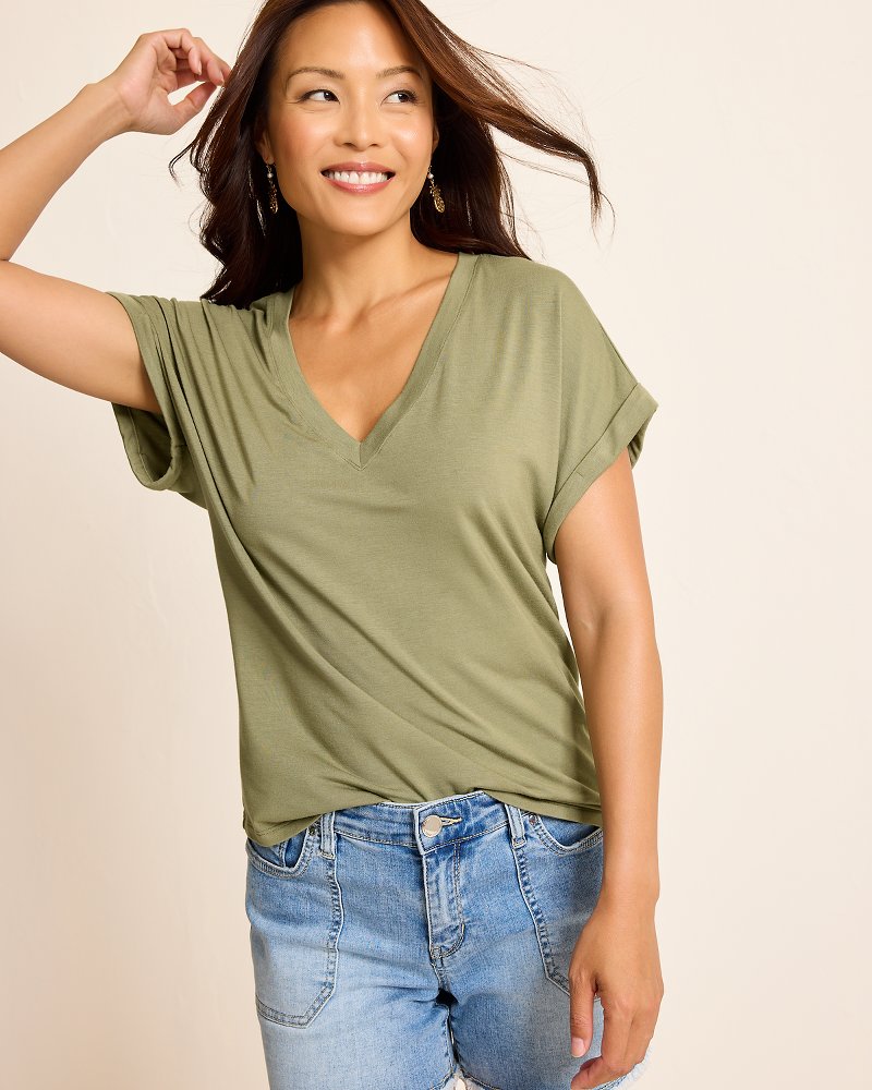 Your basics deserve the softest fabrics, try this modal-blend t-shirt with a touch of stretch. A flattering V-neckline elongates the body and perfectly showcases short length necklaces.