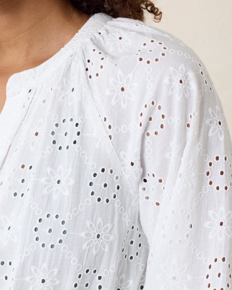 Seaside strolls just got a lot more elegant… This elongated shirt dress, adorned with eyelet details and secured with a customizable tie waist, moves effortlessly as an enchanting coverup silhouette.