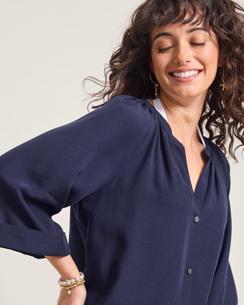 Add an easygoing layer to breezy days by the shore with this airy beach shirt, crafted from an elegant linen blend with a flattering, elongated dolphin hem that lets you show off your bikini bottoms—or you can pair it with its flowy, matching pants for an effortless ensemble.