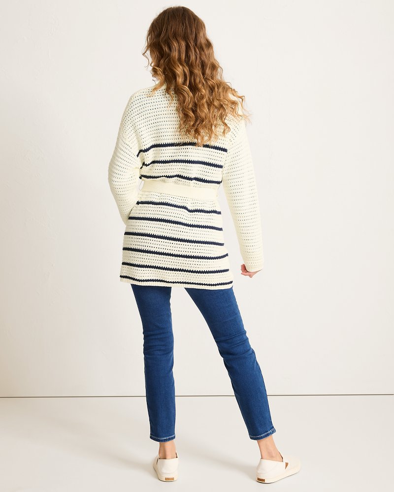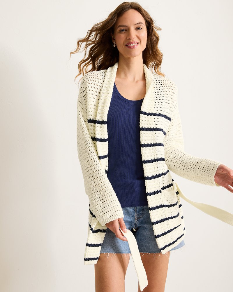 Delicate and warm, all at once, this crocheted cotton cardigan is an effortless layer for paradise, complete with a chic belt to cinch the waist and a chic stripe pattern for classic coastal appeal.