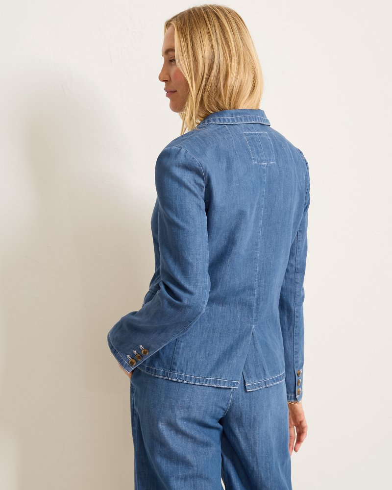A hint of linen adds a note of luxury to this denim blazer, creating a super trendy style that strikes that just-right balance between laid-back ease and sophistication, whether you pair it back to denim or airy linen pants.